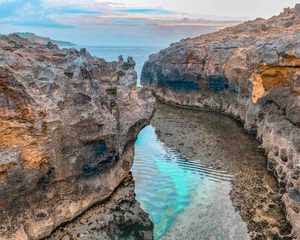 Billabong is an Australian term that usually refers to a secluded pond that was abandoned after a river's flow changed. Here, it is a natural pool embedded in the cliff. It is filled with clear water at high tide. And natural pools appear at low tide. The water is very clear and quite fun to swim at low tide.